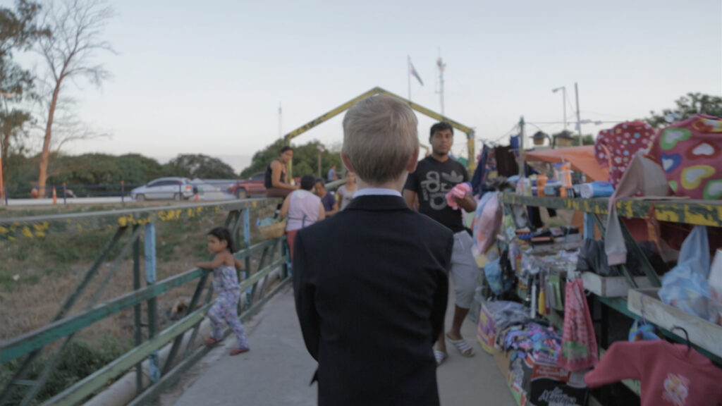 Cuando enfocan a Ángel Omar Stegmayer Caballero vemos, por primera vez, una desprolijidad en la puesta: la cámara abandona su objeto de retrato, uno de los tantos mercados de la zona en un plano general de frente, y en la continuidad de un torpe paneo posa su mirada sobre el niño. Algo se evidencia: el desplazamiento que hace la cámara para llegar a quien los encontró primero. Luego, antes de ver el producto-imagen de su entrevista —similar en procedimiento al de los primeros entrevistados—, aparece una precaria grabación de celular mostrando cómo se está dando la situación. Ángel, 9 años, rubio, se planta firme frente a la masa de realizadores y técnicos que lo apuntan con sus aparatos. Como si la película tuviera que, para retratar al niño, primero demostrar el corrimiento necesario para llegar a la singularidad de lo que se busca retratar. No basta con simplemente mostrar al testimonio; es fundamental evidenciar el lugar desde el que se produce, y todo lo que conlleva hacerlo. En este gesto se encuentra una de las claves para leer la película.